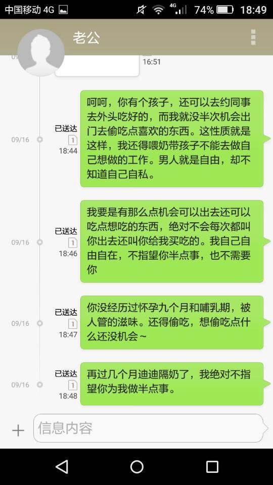 男人和女人的区别!一年半了,为了孩子戒掉了好多不能吃的东西,忍了很久了都是为了孩子好,就特么想吃点想吃的东西,都指望他很久!说吃了有什么问题我自己负责,吃那么一次辣的东西就孩子不好了?一年半,天天呆家里邻居这里,不能出去,一想出去就说孩子怎么的就是我的事,还说我现在主要就是看孩子哪里都别想去,难道女人有个孩子就没半点自由了,男人就继续自由!这就是差别!😔
