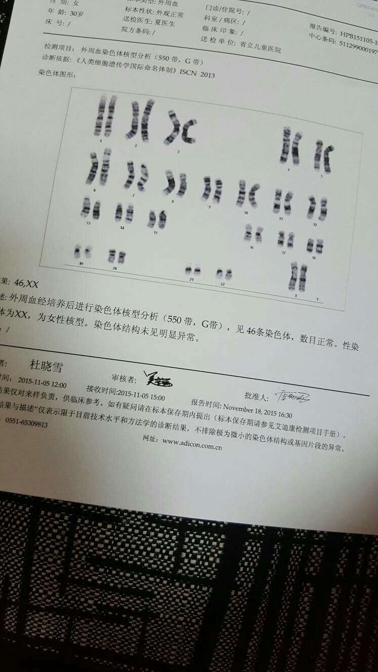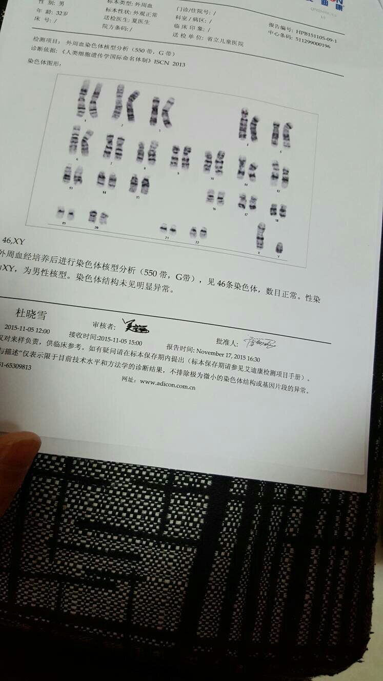 夫妻双方的染色体核型分析550带g带正常吗?因为身体原因做的试管,孕期检查一切正常,做唐筛也是低