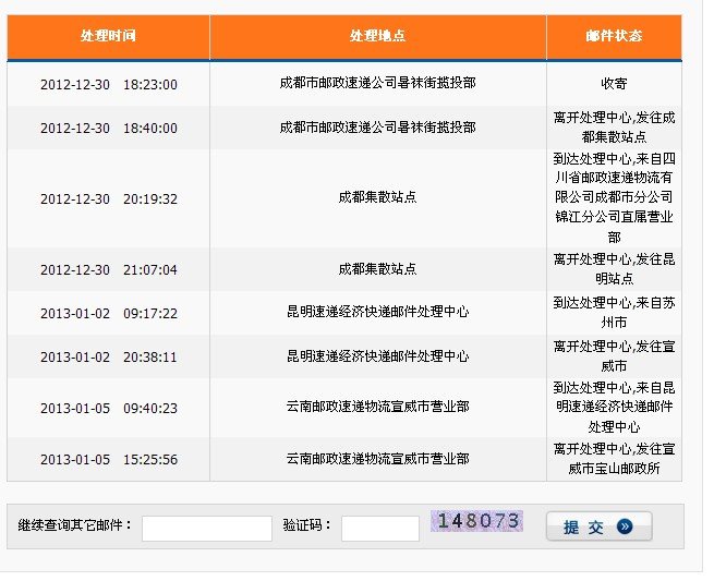 么么,乌龟一样的EMS,最后一条1月5号从宣威发往宝山镇,宣威到宝山镇车程1个半小时,但是到今天已经三天了,我怀疑EMS是不是用乌龟给我发快递啊,我服额,上面的昆明到宣威车程也才3小时也用了3天,我服了,没断奶的国企,你什么时候才能长大啊...................