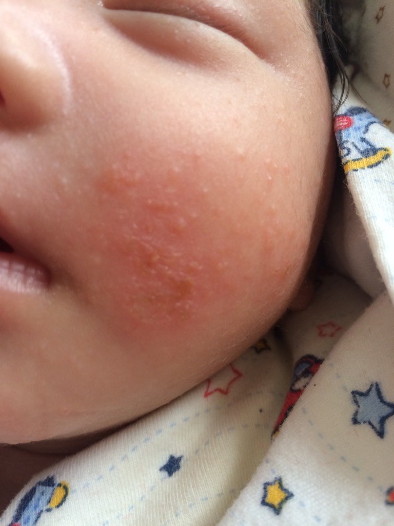宝宝脸上这个是湿疹吗?从脖子以上都长好多一粒粒的点点,都一个星期了还不好,我家婆说是上火了,我觉得