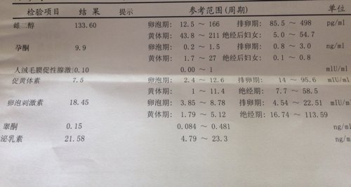 麻烦专家帮帮忙、我已经快两个月没有来月经了,去医院做了这个性六项检查,可是看不懂!麻烦专家帮忙看看 麻烦专家帮帮忙、我已经快两个月没有来月经了,去医院做了这个性六项检查,可是看不懂!麻烦专家帮忙看看结果!谢谢了! 点击展开 匿名用户 2015-03-22 15:56 推荐回答 都在正常范围,你的月经患坐问题应该与内分泌无关,请到当抓之峡地医院妇科详细判断病因。殖务 2015-03-22 16:01 宝宝知道提示您:回答为网友贡献,仅供参考。 为您推荐: 其他回答 都是正常的, 匿名用户 2015-03-22 16:02 相关问题 月经2个月没来…去医院检查没怀孕…已照B超和性激素6项…求医生帮忙看下~B超显示双卵巢未见占位 我迟迟不怀孕是怎么回事?月经第三天抽血检查过性激素六项没问题,请问,月经第几天能检查宫劲呢?该做什 我淋年38岁,每次来月经都好多,而且持续都有十多天,到医院去刮过片是正常的,做性激去6项医生说我有
