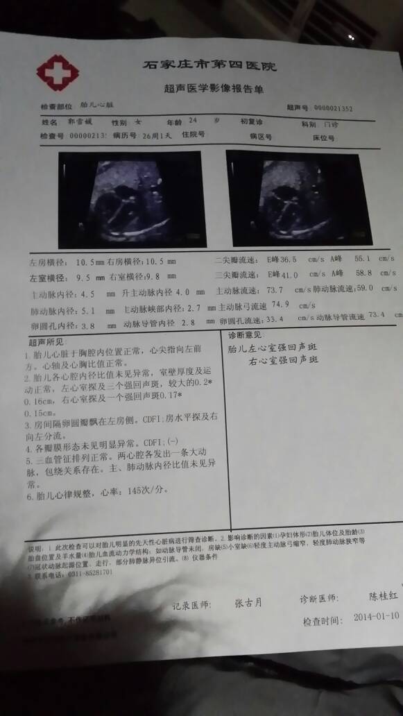 孕妇26周,做心电彩超发现宝宝左心房有3个强回声斑,右心房有一个强回声斑,现在要复查做手术,查染色