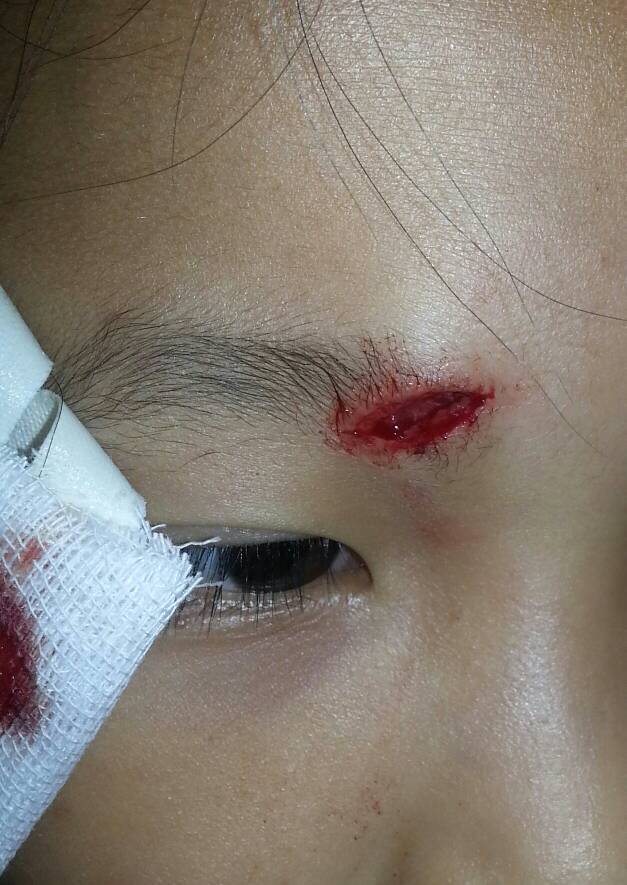 我家小孩在小区里玩的时候,被另一个11岁的小孩从远处扔过来的瓶子砸了一个2cm长的伤口,伤口在右眼