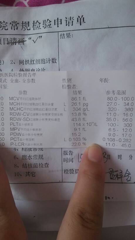 懂的帮我看看…等医生…这是血常规看我贫血不 懂的帮我看看…等医生…这是血常规看我贫血不 点击展开 梦中梦_3kUe 2016-06-06 13:25 为您推荐: 其他回答 您好,您的这张血常规的检查单的结果可能只有一半,没有看白细胞,红细胞总数及血红蛋白的值,尚不能判断是否有贫血,建议您找到另一半再看看。 566 2016-06-06 13:27 相关问题 请问医生这个是我昨天刚查的血常规,帮忙看看贫血吗? 孕28周血常规的检查单,请懂的看一下是否贫血?今天做了检查,那个大夫说话犹犹豫豫的,说红细胞压 查了血常规医生说宝宝贫血,然后开了强骨生血口服液,晚上宝就拉肚子了,还能喝么,?