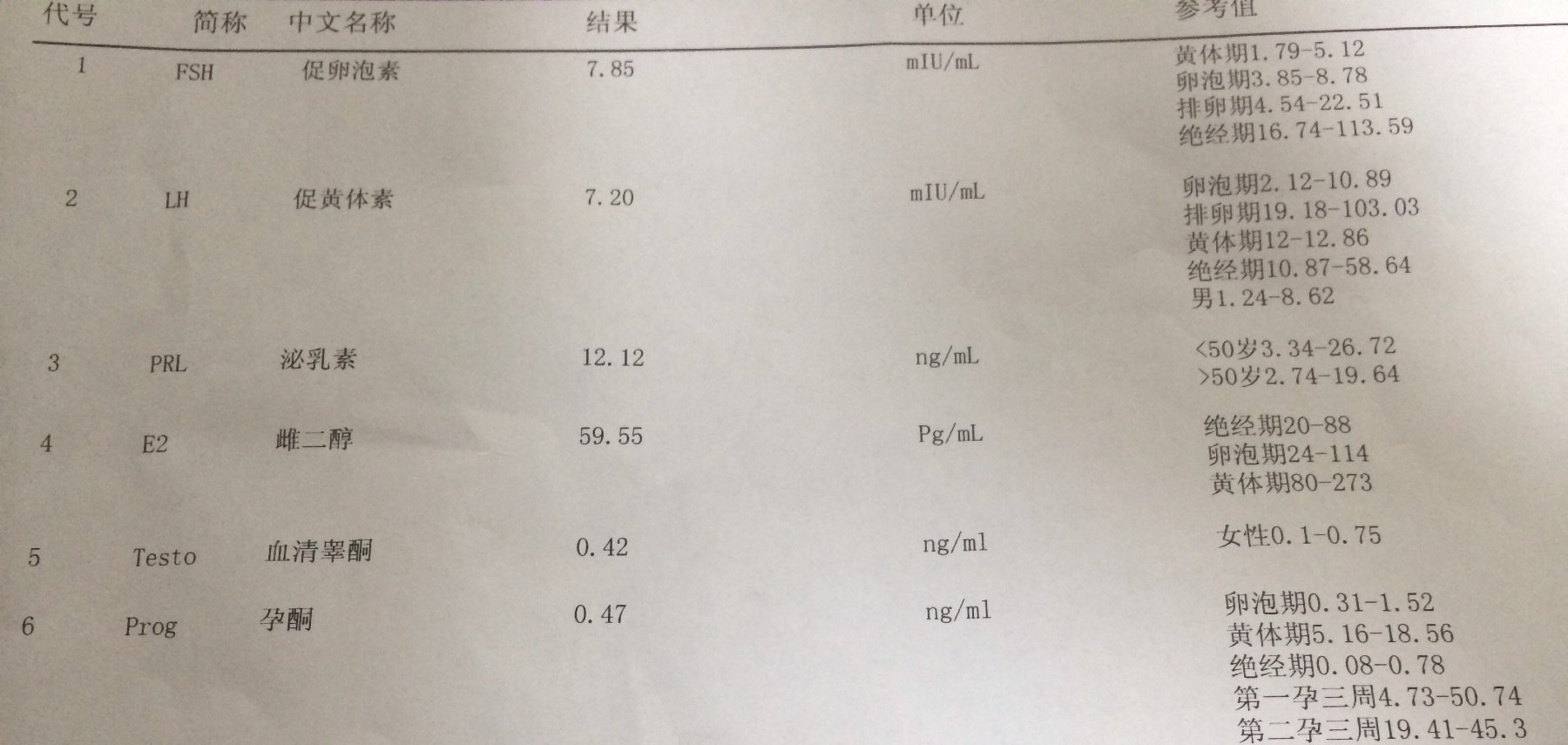 大夫您好 我月经量少 痛经 经期26-28天 月经第二天做的激素六项检查 您能帮我看看 嘛 谢谢大夫 点击展开 匿名用户 2014-03-27 19:12 为您推荐: 其他回答 病情分析: 你好,引起月经量少的原因很多,从中医辨证,有肾气虚弱导致的,有气血虚弱导致的,有淤血导致的,不知道你是哪种? 指导意见: 建议最好是到医院找个中医医生,根据你的舌苔、脉象等综合辨证后对症治疗。 匿名用户 2014-03-27 19:16 相关问题 激素六项正常,月经很规律,平均29天,不痛经大夫我月经第十 为什么我这几天没有白带,也不来月经,经期推迟6天了,小腹还一阵一阵的疼,就是给痛经的那种感觉? 阴道干涩、口干,脸部皮肤干,月经量少,无痛经,症状已经半年,激素六项正常,已吃半个月滋阴中药无明显