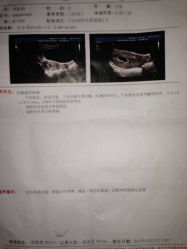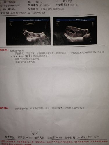医生请帮忙看看现在这张B超上显示的情况是小孩一定要流产么? 点击展开 匿名用户 2013-08-24 09:28 为您推荐: 其他回答 您好,从报告看尚未看到胎儿心搏不能断定孩子是否存活,建议一周后复查彩超看看 wangqingcai22 2013-08-24 10:16 相关问题 怀孕48天去做b超,什么都看不到,医生说是流产了,为什么试纸还显示是怀孕了呢? 今天是最后一天了 可是医生说半年内不能怀孕 可是我真的很想要个小孩该怎么办呢 虽然看过有人在流产后 流产后有8天了,这些天来有吃过医生开的药,现在吃完有一天了,明天去医院照b超,看看是否清除干净了