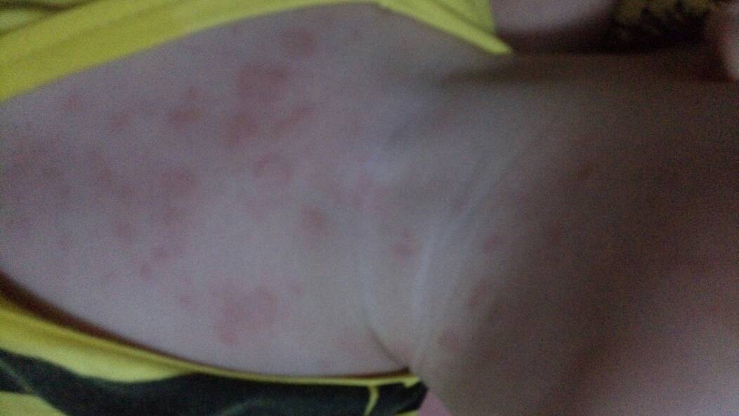 孩子身上起了红色的疹子 一片一片的 一天好了,后面一天来了 没吃药问题补充: 全身都有胳膊 腿