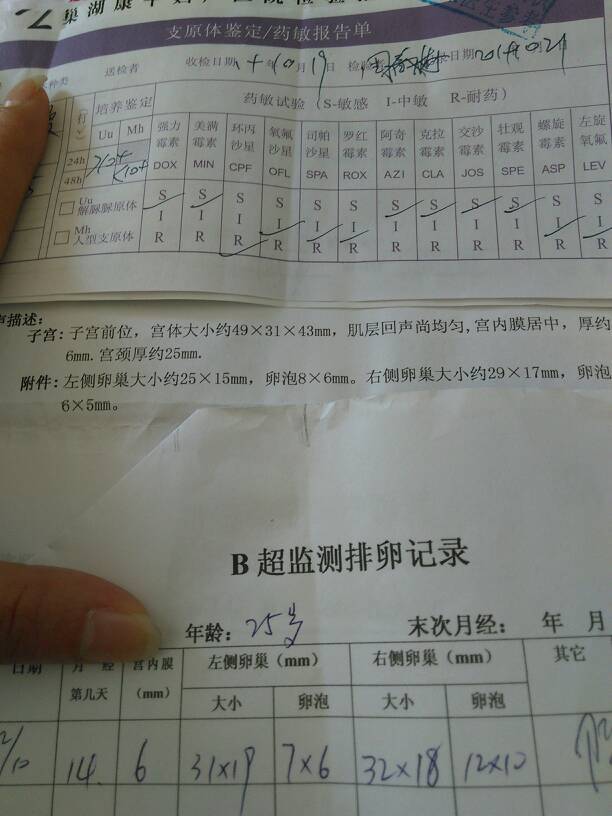 女的25岁 结婚7个月了未怀孕 去医院检查说是支原体感染 两个单子都是月经第10天去测的是超声检查报告单和支原体鉴定/药敏报告单 月经第13天又去测了 B超监测排卵记录 三个单子都在这了 希望医生帮我好好看看 严不严重 如何治疗 谢谢 希望医生解答