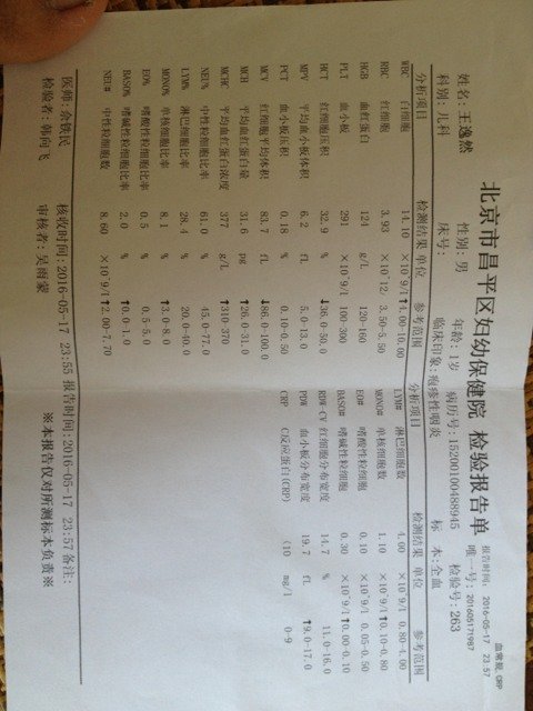 我家宝宝五月份生病疱疹性咽炎的血常规报告单,当时发烧39.3!医生能帮我看下宝宝有没有贫血? 我家宝宝五月份生病疱疹性咽炎的血常规报告单,当时发烧39.3!医生能帮我看下宝宝有没有贫血? 点击展开 縸,小染 2016-06-10 10:06 为您推荐: 其他回答 没有的,您可以复查一个 cn#BakGQQVBkL 2016-06-10 10:49 给宝宝多喝水,促进体内毒素排出哦~ 大头甜心宝宝 2016-06-10 10:25 家长您好!没有贫血,孩子现在有什么症状吗?精神状态好吗?有没有吃药? cn#BakGQQVBkL 2016-06-10 10:08 相关问题 宝宝四个半月,从早上发烧37 4、说是急性咽炎,血常规病毒感染,有点贫血 宝宝4岁4个月血常规报告单能看出是地中海贫血吗? 我宝宝前两天做了血常规,医生说有缺铁性贫血,没说要吃什么补回来,但是宝宝脸上都发白没有血色 请问这