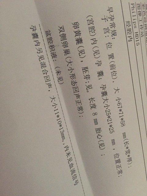 你好,你的检查显示孕囊里面有一个异常的回声,这个目前很难判断是什么引起的,可能是合并部分性破疼痛,或是双胞胎怀孕,另一个对于异常等,先这个血HCG激素测定看看是否升高明显。如果升高也不是异常高的需要进一步观察后面变化。