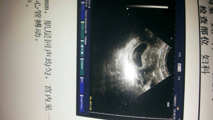 子宫后位,大小约63×58×65mm,肌层回声均匀,宫内见一类圆形孕囊回声,大小约25×15×35