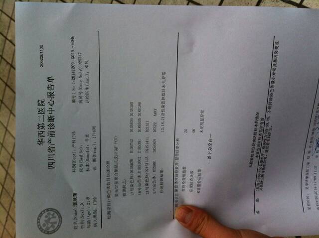 我做过羊水穿刺,这是报告单,能看出有什么吗? 点击展开 美玲子 2015-01-05 23:12 为您推荐: 其他回答 您好!根据这个检查结果,未见明显异常,结果是正常的,没有发现问题。 cn#BBpLfaVBau 2015-01-07 06:48 相关问题 请问,做羊水穿刺检查 要好久就可以拿到报告单 家人不给做羊水穿刺,听了一些歪道理,还说不要去做所有检查,不知道什么道理,烦死,不做羊水穿刺怎么能 有怀孕做了唐氏筛查18、21其中有1项是高风险的吗?能后医生建议做羊水穿刺没做的?然后没做的生了宝