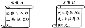 A方案刺行需花:(8+3)×200=11×200,=2200(元);B方案需花:300×8+100×3=2400+300,=2700(元).还可以这生典样A、B方案相结合购买:8张团体票,3张儿童票:需要花费:8×200+3×100,=1600+300,=1900(元),答:宝稼梅按A方案与B方案相结合购票便宜.