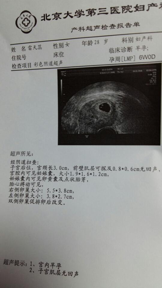 试管移植25天胎心胎芽都有,有一点血等一个礼拜在做阴道b超,会有影响吗,胸突然也不胀了 试管移植25天胎心胎芽都有,有一点血等一个礼拜在做阴道b超,会有影响吗,胸突然也不胀了 点击展开 180*****340_JlLf 2016-01-16 10:09 为您推荐: 其他回答 阴超不能做,它会刺激宫缩导致流产 156*****997_VRne 2016-01-16 13:17 不知道啦! 嘟嘟☞宝妈 2016-01-16 13:16 做阴超容易流产 151*****347_YirU 2016-01-16 13:12 注意保胎休息 爱樱花雨 2016-01-16 13:10 应该没事。 胖嘟嘟的乐乐 2016-01-16 12:57 加载更多 相关问题 我移植试管婴儿14天HCG:83 16天翻倍180,现在移植后30天了今天做阴道B超,只看到孕囊0 8*0 8无胎心胎芽 早孕去医院做阴道B超的检查,被医生用仪器弄的很疼,然后流少量鲜红色的血,这是怎么回事 怀孕两个月阴道流出褐色的血B超做不出子宫内有胚胎怎么回事