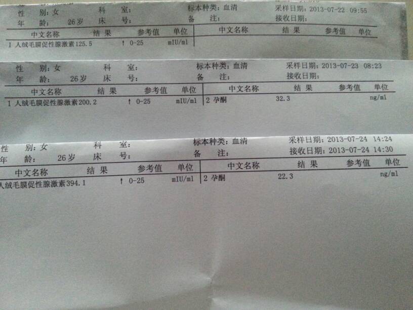 我末次月经是6.19,周期38-40天 7月19日zzy测到弱阳,之后连续两天都是弱阳 22-24日验了血,hcg是有隔 我末次月经是6.19,周期38-40天。7月19日zzy测到弱阳,之后连续两天都是弱阳。22-24日验了血,hcg是有隔天翻倍,但孕酮过了一天就降了这么多是怎么回事啊?而且我还会小腹正中间隐痛,(像今天一个上午都在痛,下午不痛)但无出血,有少量白带分泌物。 点击展开 匿名用户 2013-07-24 18:07 为您推荐: 其他回答 孕酮量减少,和您的体征结合考虑先兆流产的可能,建议做个彩超看看,进行保胎治疗,加强营养,注意休息!祝您和孩子健康! wangqingcai22 2013-07-24 19:10 相关问题 6 19号走的月经,7月21号抽血检查HCG:14 27 请问是怀孕了吗 HCG值正常吗?验孕试纸7 25日弱阳 我5月11来的月经,每次周期都推后几天,6月26日抽血结果人绒毛膜促性腺激素hcg 9847,孕 我5 11来的月经,月经周期一般是33天,6 26日去医院抽血结果人绒毛膜促性腺激素hcg 98