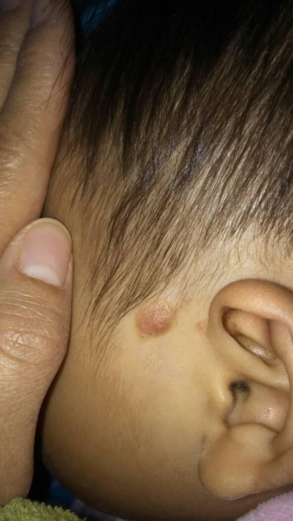 有谁知道这是什么疙瘩?宝宝鬓角处长的,从生出来就慢慢这么大了,应该是跟着她长大就长
