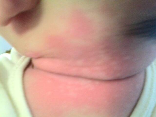 刚才宝宝吃完鸡蛋糕,吃了点米粉,就洗澡了,脖子这么红还有小白泡!请问怎么回事?