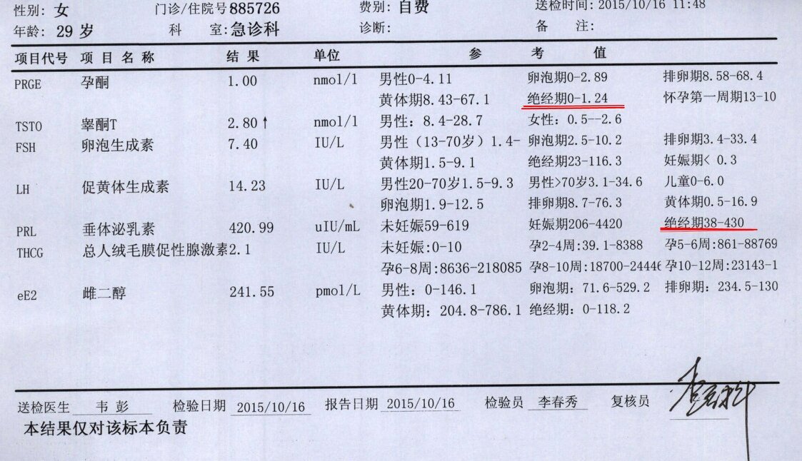 我最后一次月经是八月中旬,到现在十月都没来了,闭经两个月了!去医院做性激素六项检查,这是检查结果
