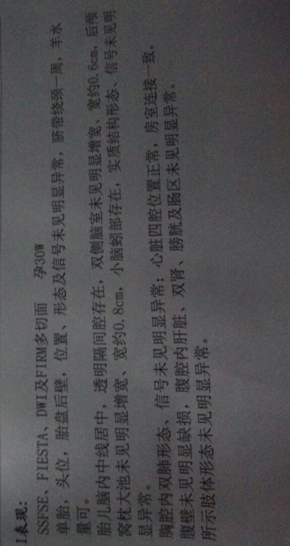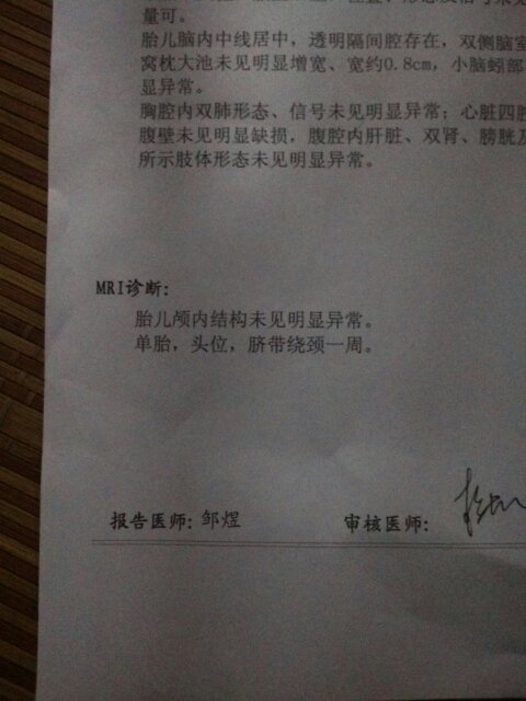 希望有专家帮我看看我的磁共振单子,,是因为胎儿后颅窝池深1.1做的磁共振 点击展开 匿名用户 2015-08-05 13:28 满意回答 你这个MRI未报脑子有问题,但存在脐带绕颈1周。 ɳĮ 2015-08-05 13:30 宝宝知道提示您:回答为网友贡献,仅供参考。 相关问题 胎儿后颅窝池深1 1做的磁共振 胎儿小半球销分离,后颅窝池深10MM,怎 大家帮帮忙呢,今天老婆去做胎儿排畸检查,主要是胎儿右肾盂分离:7MM,左肾盂分离:4MM 后颅窝池深7MM