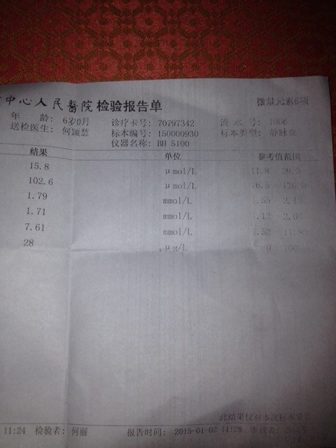请求医生帮忙看看我小孩微量元素正常吗 点击展开 《赌行》 2015-01-04 14:46 为您推荐: 其他回答 你好,宝贝各项微量元素都在参考值之内,是正常的,不需要担心,合理膳食即可、 野鸭子7205 2015-01-04 15:54 相关问题 我家宝宝六个半月,今天化验微量元素显示不缺钙,都正常,但是医生说以我家宝宝状况是缺钙表现,那怎么办 请求医生帮忙看看孩子估计有多重 请求医生帮忙看看,预产期过了三天,我想顺产,怎么办?能等吗?