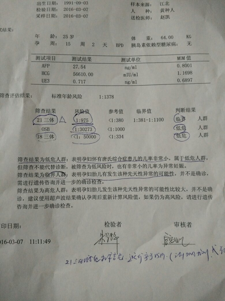 唐筛21三体风险值1:975临界值1:375 1:1100这样危险吗对宝宝? 点击展开 本宫不死,你终究是妃_alCf 2016-03-08 18:19 满意回答 21三体临界高风险,建议行无创DNA进一步检查排除胎儿畸形。 lundshany55 2016-03-08 18:23 宝宝知道提示您:回答为网友贡献,仅供参考。 相关问题 唐筛结果:21三体风险是1:1100,医生说临界风险,可化验单上写的大于1:270才是风险,到底什 我老婆1986年出生,最后一次月经是2012年5月16日,2012年9月11日做的唐筛,21三体值:1/220,医生写的孕期 唐筛21三体综合症风险值1:360临界风险,请问危险吗