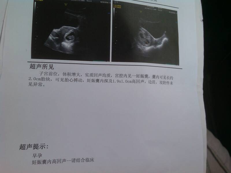 上次做B超,提示妊娠囊内高回声,今去复查,妊娠囊内还是有而且高回声体积还增大了,医生也说不出个所以 上次做B超,提示妊娠囊内高回声,今去复查,妊娠囊内还是有而且高回声体积还增大了,医生也说不出个所以然来,伤心,可能过几天孩子就要离我远去了。 点击展开 家之所在.唯心所系之处℡ 2016-01-19 17:00 相关问题 彩超报告单:子宫体积增大,后位,形态饱满,于宫腔内可见2 3×1 4㎝妊娠囊回声,内可及卵黄囊,探 上次做B超,提示妊娠囊内高回声,今去复查,妊娠囊内还是有而且高回声体积还增大了,医生也说不出个所以 子宫前位,体积稍增大,肌壁回声均匀宫腔内可见大小约27X19mm的妊娠囊回声,内看见卵黄囊