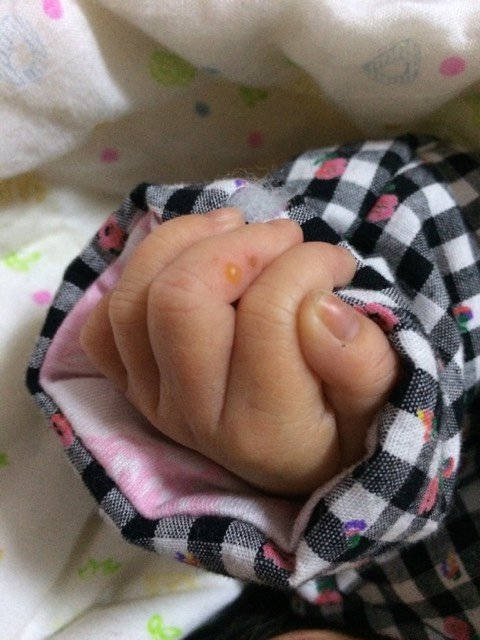 宝宝,出生一周了,第五天的时候发现右手中指长了一个黄色水泡,去医院,医生说观察一下,是不是烫伤,但