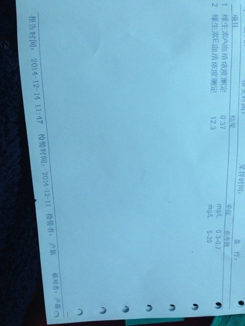 可以帮我看看化验结果吗?自己不是很理解,谢谢医生 可以帮我看看化验结果吗?自己不是很理解,谢谢医生 点击展开 做牛粪的丫头 2014-12-14 12:03 为您推荐: 其他回答 从化验单上看,血清中维生素A和维生素E浓度两项指标均在正常范围内的。 YR悦然 2014-12-14 12:59 祝你好孕! 182*****221_OvOV 2014-12-14 12:36 祝你好运,检查了就问医生吧 荥洋嘛嘛 2014-12-14 12:34 正常范围内 阿德呀阿德 2014-12-14 12:33 祝宝妈好孕 150*****423_Ik9N 2014-12-14 12:30 加载更多 相关问题 麻烦医生帮我看看这个报告单 急急急 谢谢 医生、懂得人帮我看看!宝宝多重了!谢谢! 有医生吗帮我查下宝宝现在有多重?谢谢 各位宝妈也帮我看看宝宝有多重 谢谢