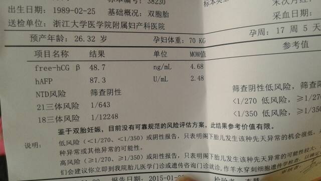 有双胎做过唐筛的宝妈没有?帮忙看看 有双胎做过唐筛的宝妈没有?帮忙看看 点击展开 184*****488 2015-01-26 18:19 为您推荐: 其他回答 您的唐氏检查的结果都是在低风险,这种情况说明发病的几率比较低,在临床基本算是正常的。 renzhengxin11 2015-01-27 09:31 路过。。。 洛阳第二 2015-01-26 21:58 这不很好吗 别担心 西伯的妈妈 2015-01-26 19:12 不是,,, 佈佈 2015-01-26 18:40 宝妈好厉害啊… 姐丑姐自豪 2015-01-26 18:34 加载更多 相关问题 有多少宝妈,做了唐筛检查啊 宝妈们,做唐筛你们都是空腹吗?空腹和不空腹有影响吗? 有烟台的宝妈嘛知道烟台医院做唐筛多少钱