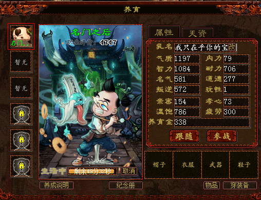 最难的呢,就是重养,花费5500W游戏币重养,这个要懂养育系统,养成更高的评价,更好的结指北局。别问我怎么养的攻略,你懒得去官网查看,是你的事。 穿上兔评涉一套装备,最简单最快速的办法,再洗掉上面的一点玩性,立杆见影直接了当。 学习气质以外的其它属性,就是学习学习再学习,评价增长超级慢,回答完了。 补充的是:结局后,娃仔的工作去地府,生活去太医院。 追问也不作回答,因为回答已经足够全了,再答也是重复来筝狗重复去,无聊。