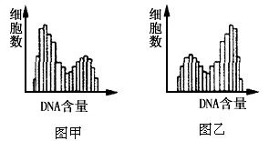 图甲表示某哺乳动物细胞在正常培养中,某时刻所测得的不同DNA含量的细胞在整个细胞群体中的分布情况。向该培养液加入某种化合物并继续培养几小时后,分布情况如图乙所示,则该化合物所起的作用是 [ ] A.抑制DNA复制 B.刺激细胞分裂 C.抑制RNA聚合酶的活性 D.抑制细胞质分裂