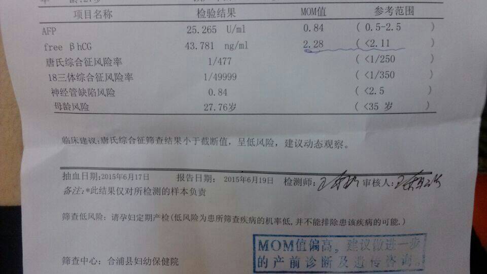 这是检查单,MOM值偏高,不知有没有影响?求解 这是检查单,MOM值偏高,不知有没有影响?求解。 点击展开 ※发明※ 2015-06-25 19:05 为您推荐: 其他回答 祝宝妈好孕 琪琪儿时 2015-06-26 12:40 祝宝妈好孕 zhi_WGoO 2015-06-25 21:33 建议换家医院检查下 紫嫣缘 2015-06-25 21:02 还是进一步检查一下比较好 幸福小女人_SzTX 2015-06-25 20:40 ????? Yang XL 2015-06-25 20:32 加载更多 相关问题 FREE B-HCG的MOM值偏高会是唐宝宝么? 怀孕17周HCG正常值应该是多少?如果HCG MOM偏高对胎儿有影响吗? 唐筛free cHG MOM值为4 77,偏高很多怎么办?胎儿有什么问题吗?