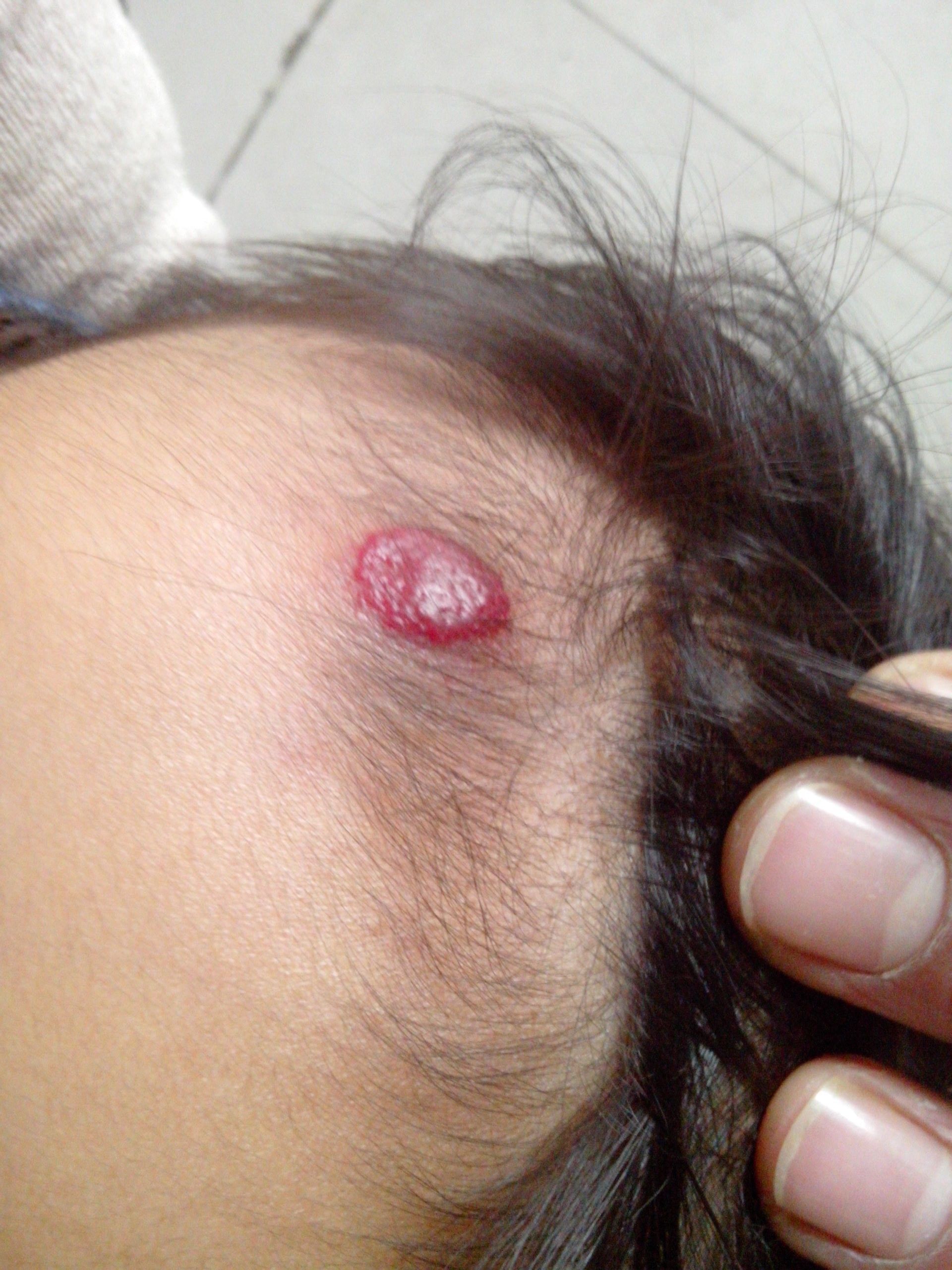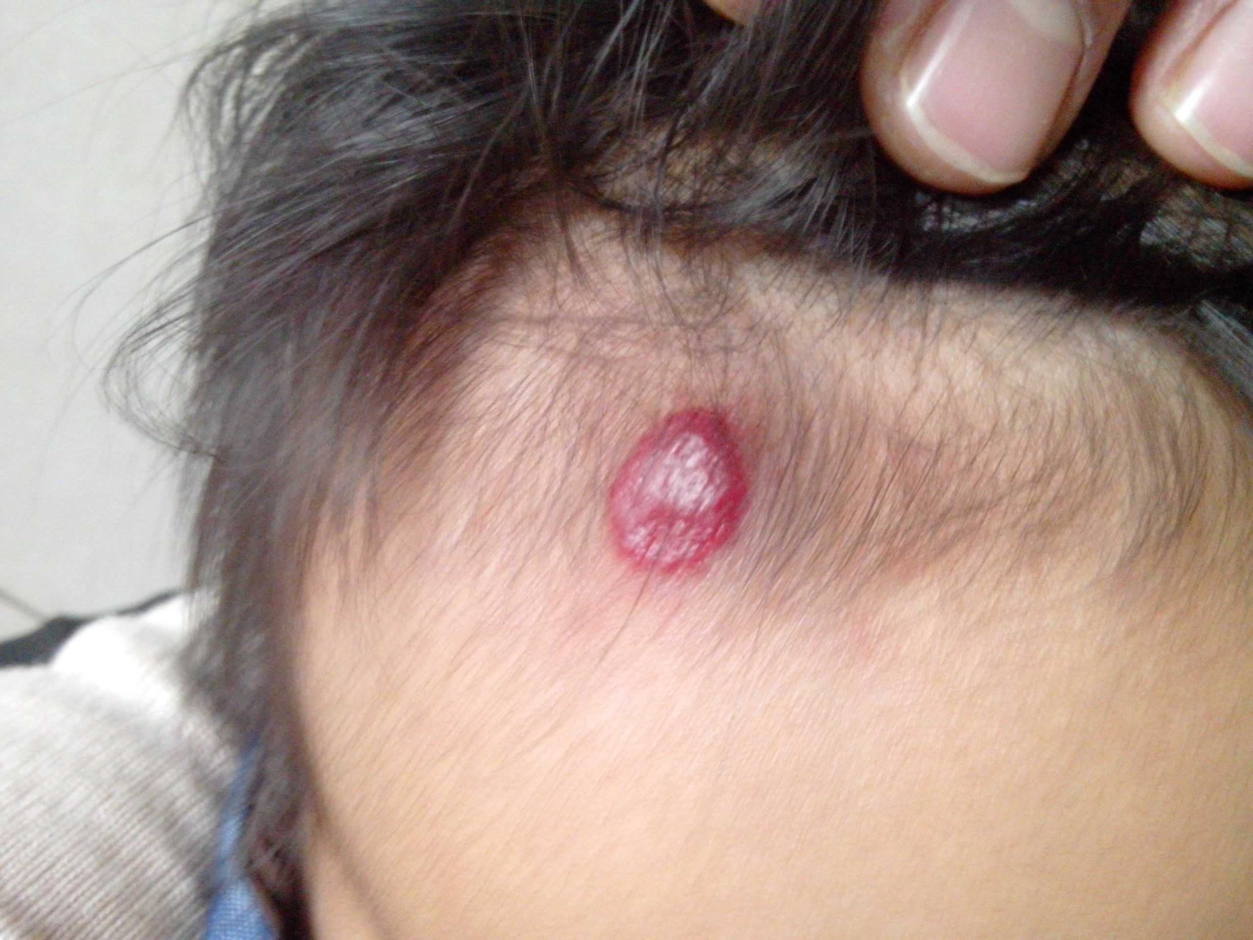 您好,医生请问这是什么血管瘤?宝宝刚出生一个月这样才发现针眼大小的小红点,现在九个月了有一厘米左右