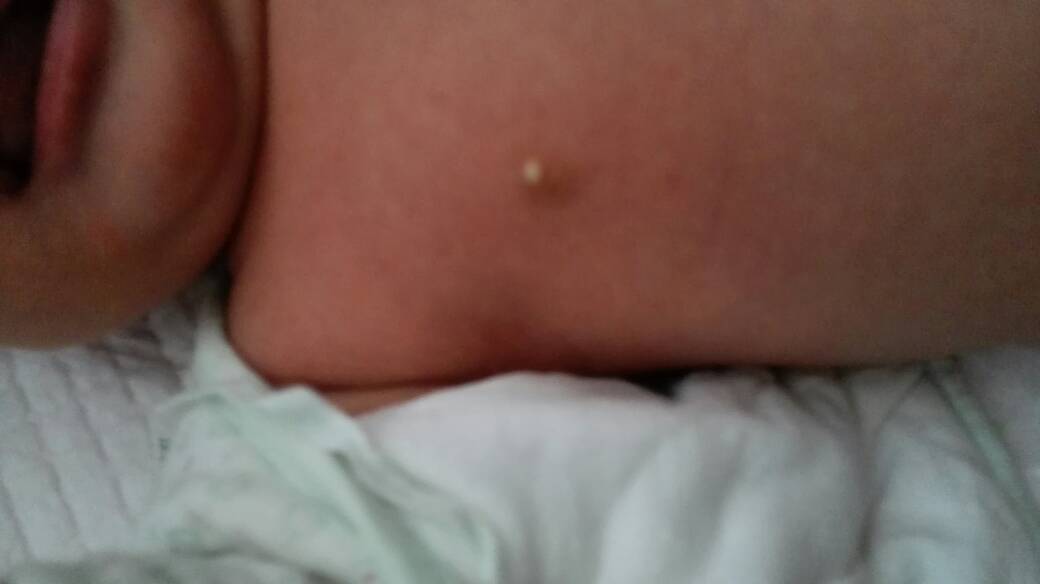 医生请给看看,我们宝宝一出生左乳房上就有个痘痘,在医院时医生说注意观察这都快40天了 一直没变化