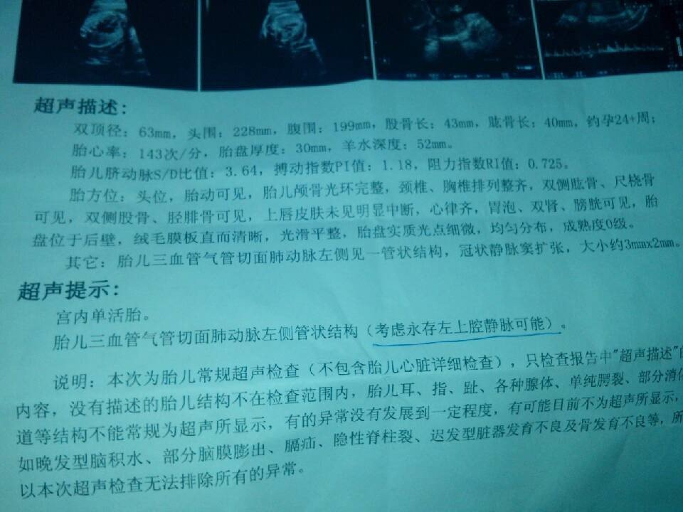 彩超显示胎儿三血管气管切面肺动脉左侧见一管状结构,冠状静脉窦扩张,大小约3mm*2mm 我还有必 要去做进一步诊断吗? 点击展开 匿名用户 2014-05-15 15:29 为您推荐: 其他回答 病情分析: 一般的来说都是没事的,而且检查也是有误差的存在的。 指导意见: 别担心,孕妈妈的心情很重要,一定要保持好的心情。 赫亦凝_2Vv0 2014-05-15 15:54 相关问题 胎儿三血管气管切面肺动脉左侧可见一直经0 2CM的血管,注入冠状静脉窦,冠状静脉窦内径0 45CM,超声提示: 四维彩超检查说胎儿心脏三血管不清楚?问题大不大? 胎儿32周了做三维彩超和四维彩超都说宝宝左大腿可能有血管瘤小孩能生下来吗?