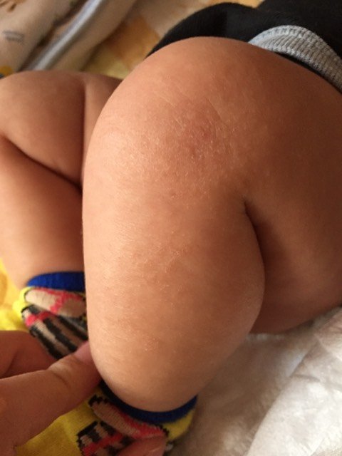 有医生吗,帮忙看看这是不是毛孔堵塞造成的 最近一直用橄榄油给宝宝按摩 难道是湿疹?求解