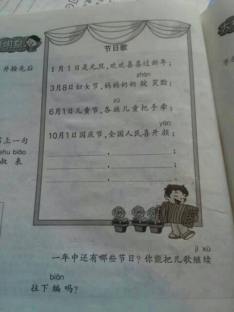 儿歌怎么往下编 点击展开 匿名用户 2014-06-25 16:29 为您推荐: 其他回答 5月一日是劳动节 农民伯伯笑开颜 匿名用户 2014-06-25 16:36 八月十五中秋节,各家各户齐团圆 匿名用户 2014-06-25 16:31 10月2日端午节,大家齐聚来过节 匿名用户 2014-06-25 16:29 相关问题 《乖乖》编儿歌 为爸妈做5件事编儿歌怎么写 做梦梦到外公带我上学走错了路让我哭了编一首儿歌,请问该怎样用这个梦去编儿歌啦