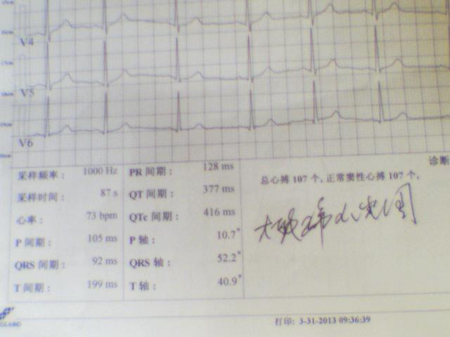 16岁小孩经检查:心率:73bpm,采样频率:1000Hz,采样时间:87s,请高手帮我看看分析一下 谢谢! 点击展开 匿名用户 2013-04-01 16:46 为您推荐: 其他回答 这个最好求助一下你医院的朋友,一般的人看不懂啊 匿名用户 2013-04-03 18:03 相关问题 心电图上的数据为:采样频率:1000Hz采样时间:25心率:17… 医生你好,小孩心率不稳定,,经常听胎心好么? 怀孕三十周窦性心动过速频率1000hz,心率111bpm
