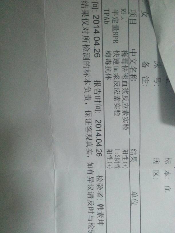 我怀孕32周的时候验血,rpr梅毒快速血浆反应素实验结果是阳性加 半定量rpr快速血浆反应素实验结