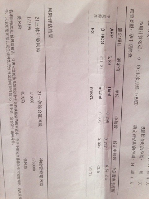 大家帮忙看一下这结果正常吗? 大家帮忙看一下这结果正常吗? 点击展开 Love~宝贝 2014-10-17 08:11 为您推荐: 其他回答 从唐氏筛查报告看,21-三体综合征和开放性神经管缺陷都是低风险,说明胎儿患病的可能性较小。建议暂时观察,定期产检。 wzlzx520 2014-10-17 11:09 从整体上来看一切正常哦,祝你好孕! 遗忘遗忘 2014-10-17 08:31 都是低风险呢,没问题 ミ釋懷了 、 2014-10-17 08:26 不懂~*^_^*祝宝妈好孕气*^_^* 幸福在手心 2014-10-17 08:22 应该没什么大问题 保持微笑、继续骄傲 2014-10-17 08:17 加载更多 相关问题 大家帮忙看一下宝宝正常吗! 怀孕45天b超单大家帮忙看一下正常吗? 这是我做的彩超,大家帮忙看一下