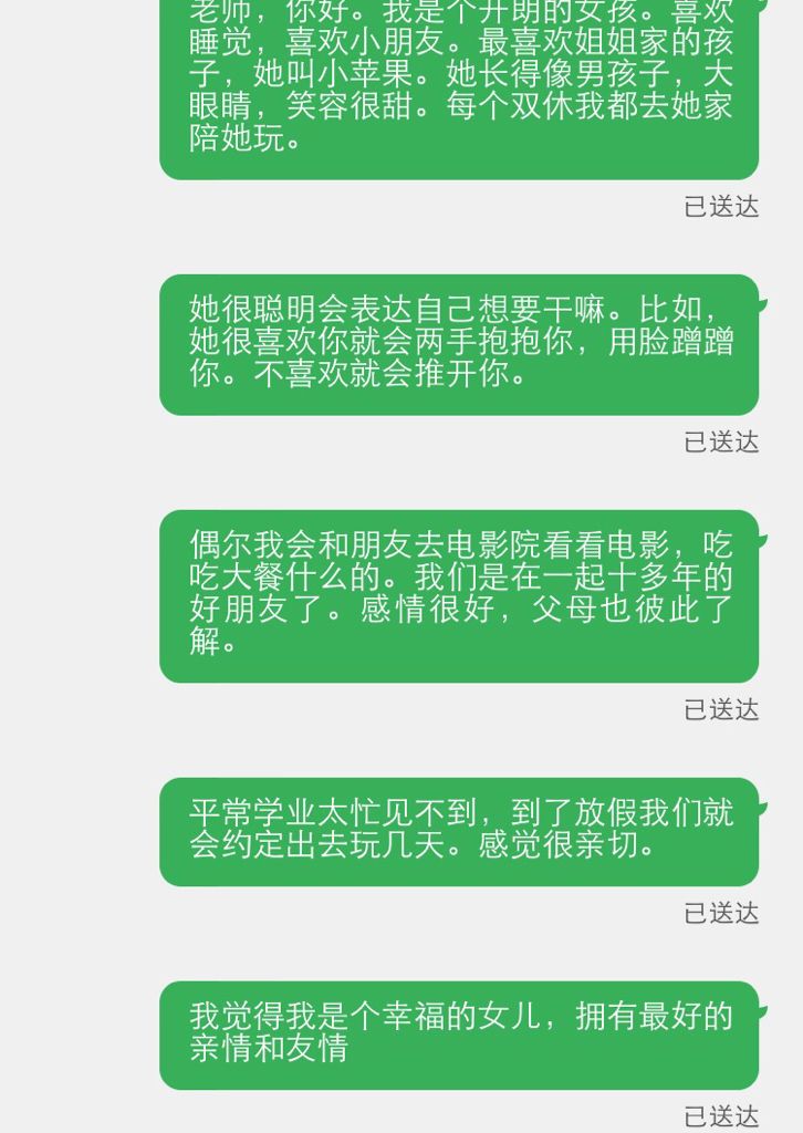 求翻译这些成日语 不要用百度金山词霸什么的 最后一句是 我觉得我是个幸福的女孩不是女儿! 点击展开 匿名用户 2015-12-24 09:24 满意回答 等我 匿名用户 2015-12-24 09:47 宝宝知道提示您:回答为网友贡献,仅供参考。 为您推荐: 其他回答 这不是你发过的自我介绍吗?? 呵呵,有人翻成那样,还点大拇哥呢。 匿名用户 2015-12-24 11:43 相关问题 日语翻译 陪女儿复诊 请问这个奶粉日语说明的中文什么意思?麻烦大侠翻译下,不胜感激哦 之前去学校开家长会,老师和我说我家孩子英语成绩不行,老师建议我在手机上下载一个金山词霸翻译软件