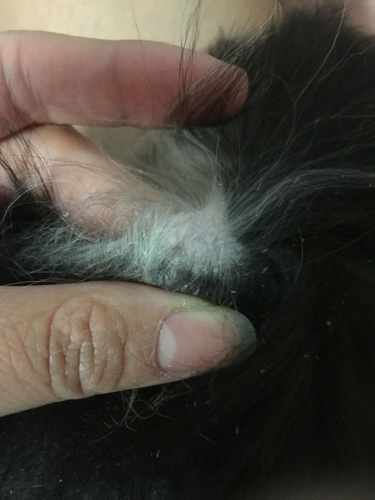 我家狗狗是雪纳瑞,五个月,最近发现在腿根部和后背上有大量皮屑,到底什么原因?怎么解决?狗粮是法国
