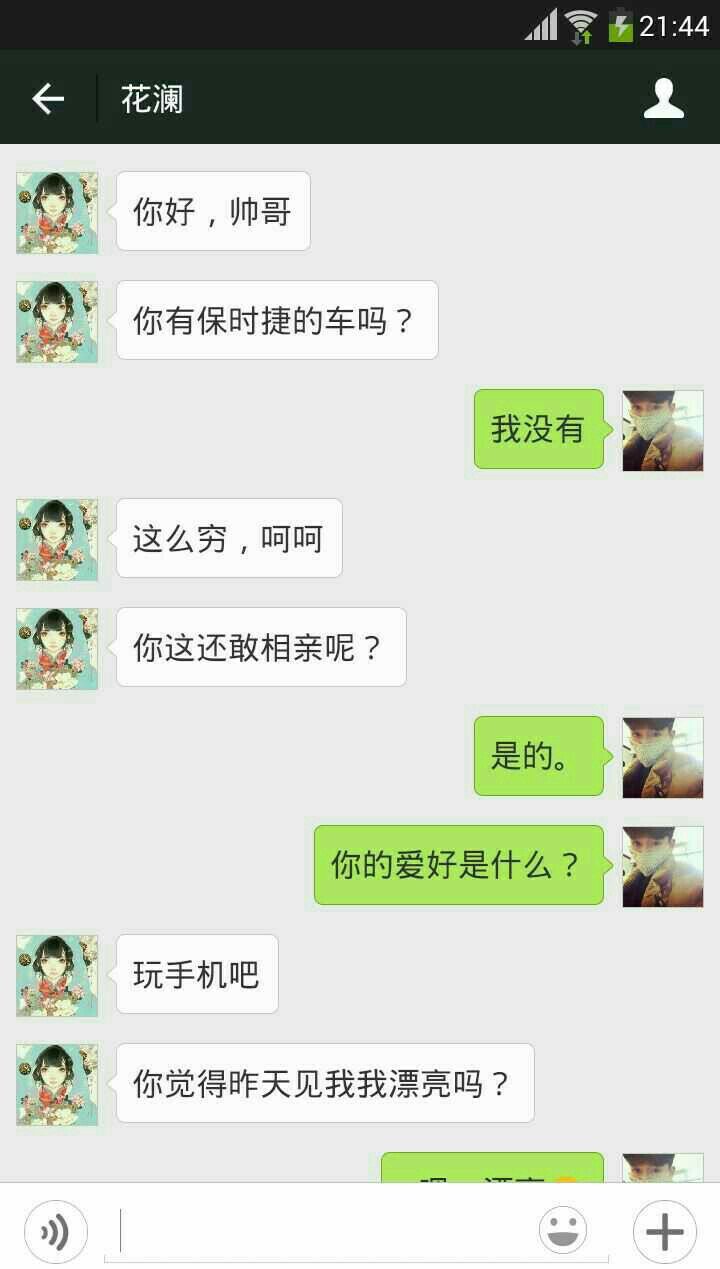 一荒抹逝、你想继续么?如果不想问问,有保时捷与她长相配么?还是处么?如果想继续先想好,你的经济是否足够让她愿意于你同甘共苦,否则后果对于你很悲惨! 二、相亲,她也轮到相亲说明彼此都待嫁待娶,原因是什么,如果奔着感情与面梨司包努力和谐成立家庭,那法斯么继续发展,反之玩玩的话,看看自己年龄与状况是否允许! 三、每个人都有自尊,如果不懂得尊重别人,即使金钱买来的婚姻无法长久!