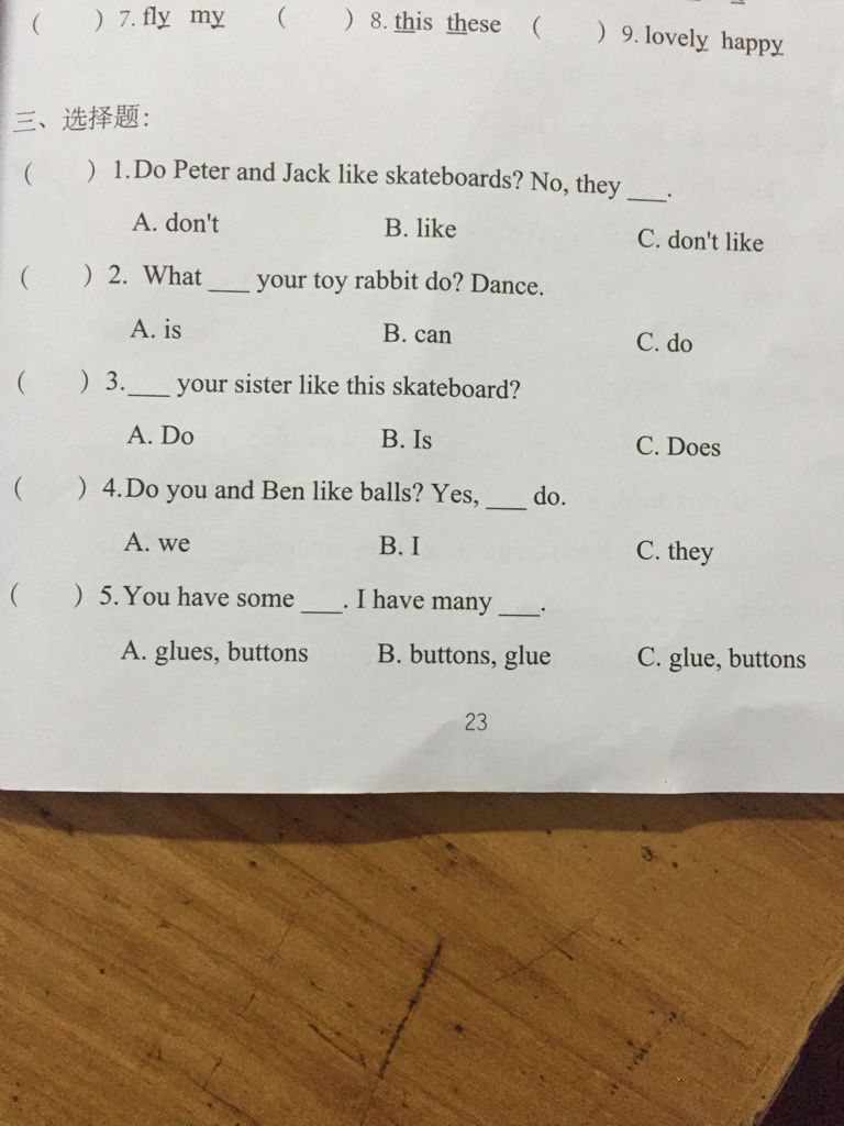 1. A 2. B 3. C 4. A 5. C (这一题是C,不是A,因为glue胶水是不可数的) 6. C 7. B 8. A 9. A 10. B 1 1. B 1 2. B 1 3. A 1 4. C 1 5. C