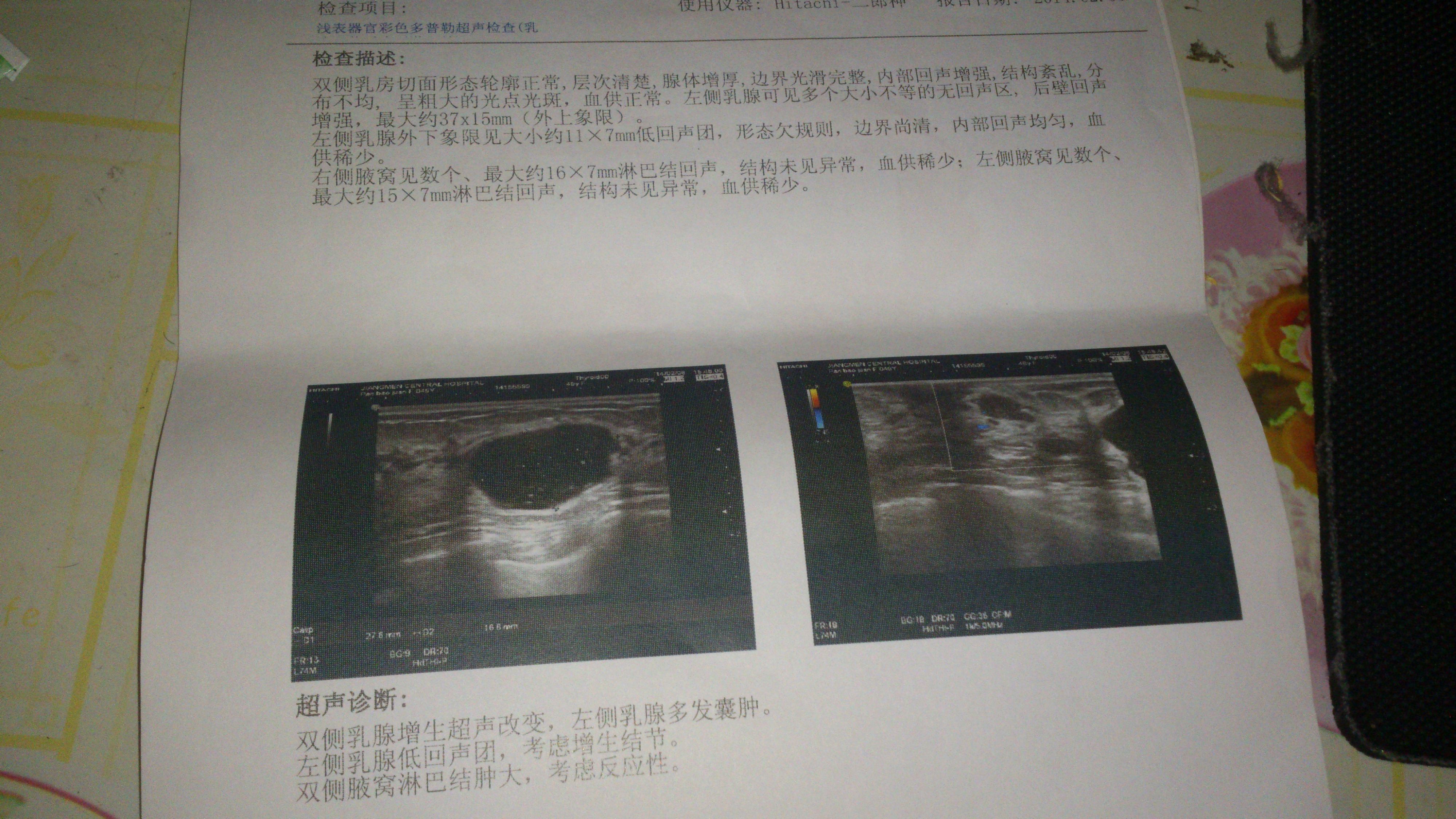 内部回声增强,结构絮乱,分布不均,呈粗大的光点光斑,血供正常。左侧乳腺可见多个大小不等的无回声区,后壁回声增强,最大约37*15mm(外上象限)。左侧乳腺外下象限见约11*7mm低回声团,形态欠规则,边界尚清,内部回声均匀,血供稀少。右侧腋窝见数个,最大约16*7mm淋巴结回声,结构未见异常,血供稀少;左侧腋窝见数个,最大约15*7mm,结构未见异常,血供稀少。详细的彩超图如下~我想问严重吗??有没有是癌症的可能??