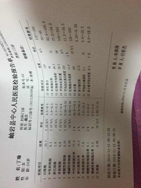37了今天去医院检查说白细胞高有没有事 37了今天去医院检查说白细胞高有没有事 点击展开 双眼皮 2014-11-14 20:23 为您推荐: 其他回答 你是细菌感染了!!!! 柔🈷茗伶 2014-11-15 01:42 白细胞总数增高,中性粒细胞比例增高,一般提示有细菌感染,下面应尽一步查何处有细菌感染。 heminghou126 2014-11-14 22:34 大部分人都有,只要不是高的太离谱就没事😜孕妇后期一般会高点 不二小资2014521 2014-11-14 21:00 有炎症,没事的 萌小宇 2014-11-14 20:30 说明有炎症啊!不过也不用太担心!! 不二小资2014521 2014-11-14 20:24 相关问题 我女儿两周岁,今天去医院检查,医生说白细胞低,正常吗? 嗯谢谢李大夫!去医院化验便便白细胞是10-12红细胞2-3其他都正常!宝宝状态还好!就是今天是拉的 小孩今天肚子痛,呕吐,发烧,去医院看了,是中性粒细胞百分比是87 9,白细胞是14 7淋巴细胞是6