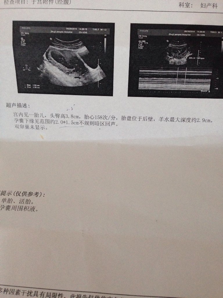 你好,这种情况表示曾经或正在有出血,但可能血并未排出来。这是先兆流产的一种。如无腹痛出血,建议尽量卧床休息,定期复查,只要它在慢慢减少就是好现象,如果有腹痛出血,可能需要在医生指导下口服或注射保胎药。这段时间严禁剧烈运动和性生活。