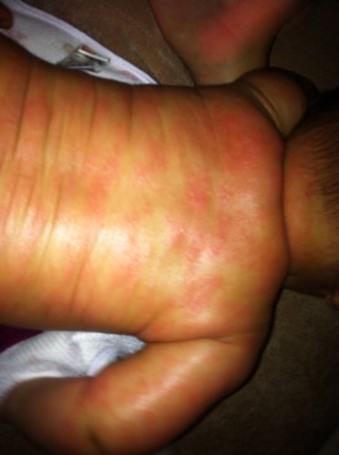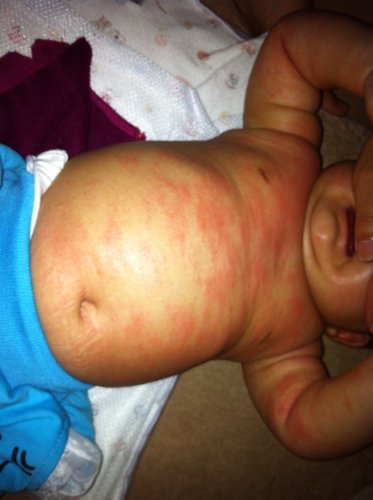 我家宝宝五个月大浑身长红疹早上醒来还好,特别是晚上洗澡后(附照片)手肘处都结壳了!用艾叶、等煮水泡