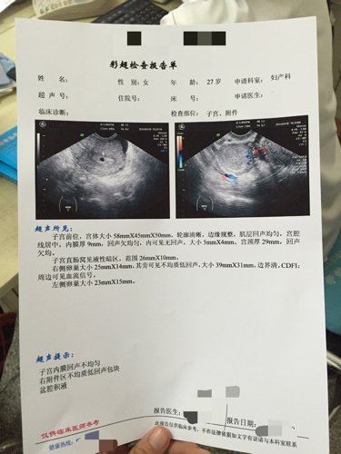 彩超检查显示子宫内有一个黑点,子宫内膜回声不均匀,右侧卵巢有囊肿,有盆腔积液 流产2个月整,来过一