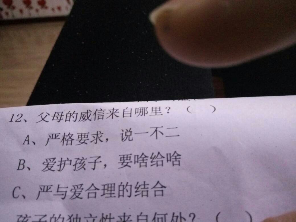 爱孩子是父母的天性,家长对子女的这种爱应 A 溺爱B理智的爱C无原则的爱 点击展开 匿名用户 2015-11-11 18:29 推荐回答 当然是理智的了,问答题,当然选C了。 树立威信不是让孩子怕你。 匿名用户 2015-11-11 18:45 宝宝知道提示您:回答为网友贡献,仅供参考。 为您推荐: 其他回答 B 匿名用户 2015-11-11 18:45 b 匿名用户 2015-11-11 18:30 相关问题 有的父母对孩子不是十分严厉,这样的父母是不是比较溺爱的? 父母为什么要溺爱孩子,::> 告诫父母不要溺爱孩子的语句
